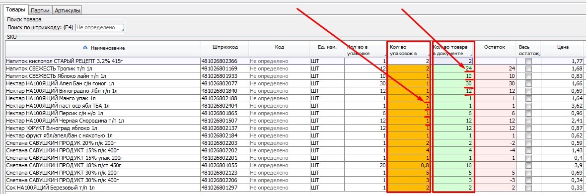 На форме подбора нам необходимо выполнить поиск необходимого товара и внести его количество в колонку "Количество товара в документе" либо "Количество упаковок".