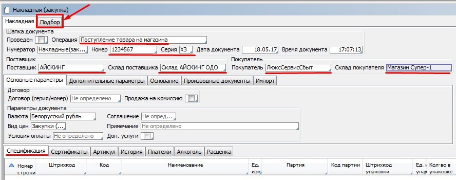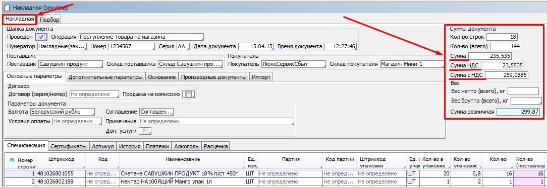 Если мы находились в закладке Подбор, то необходимо вернуться в закладку "Накладная" и сверить суммы в области "Суммы документа" с суммами в ТТН.