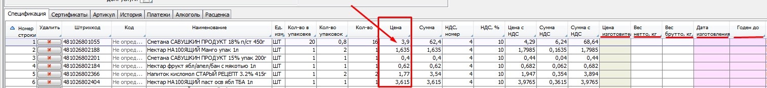 В случае когда цен согласованных с поставщиком в системе нет, тогда нам необходимо в ручную проставить цены по каждой позиции из накладной в колонке "Цена".