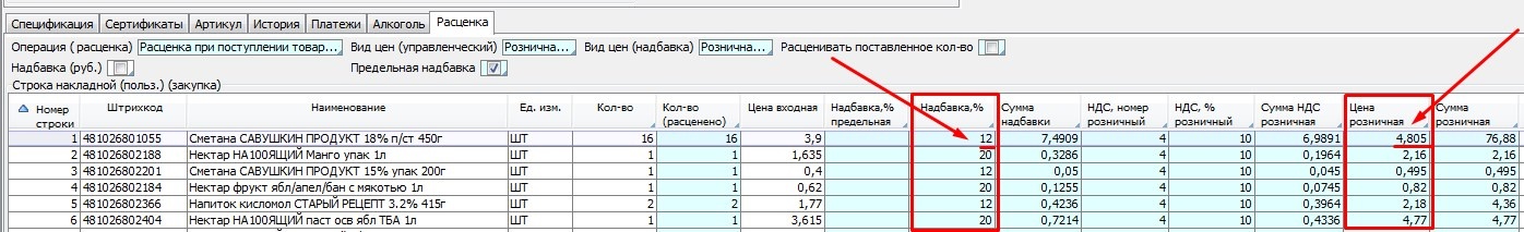 | Для формирования розничной цены мы можем изменять надбавку либо вручную внести цену розничную, тогда надбавка рассчитается автоматически. |