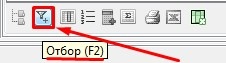- Поиск по кнопке Отбор (F2) внизу формы, путем внесения условия отбора по любой колонке (например Наименование).