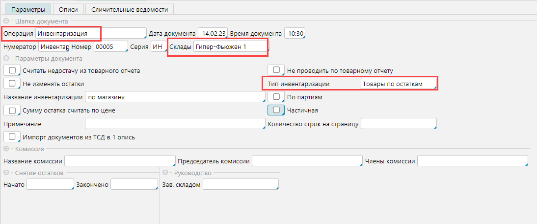 Операция - выберите подходящую операцию Инвентаризация на магазине или складе. В зависимости от выбранной операции некоторые параметры заполнятся автоматически.
