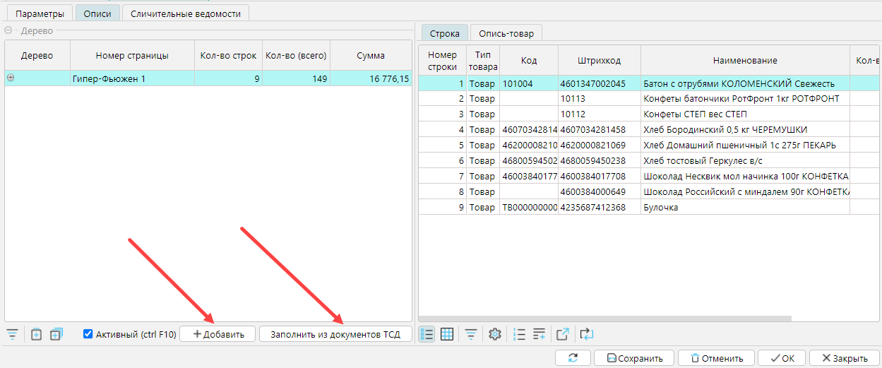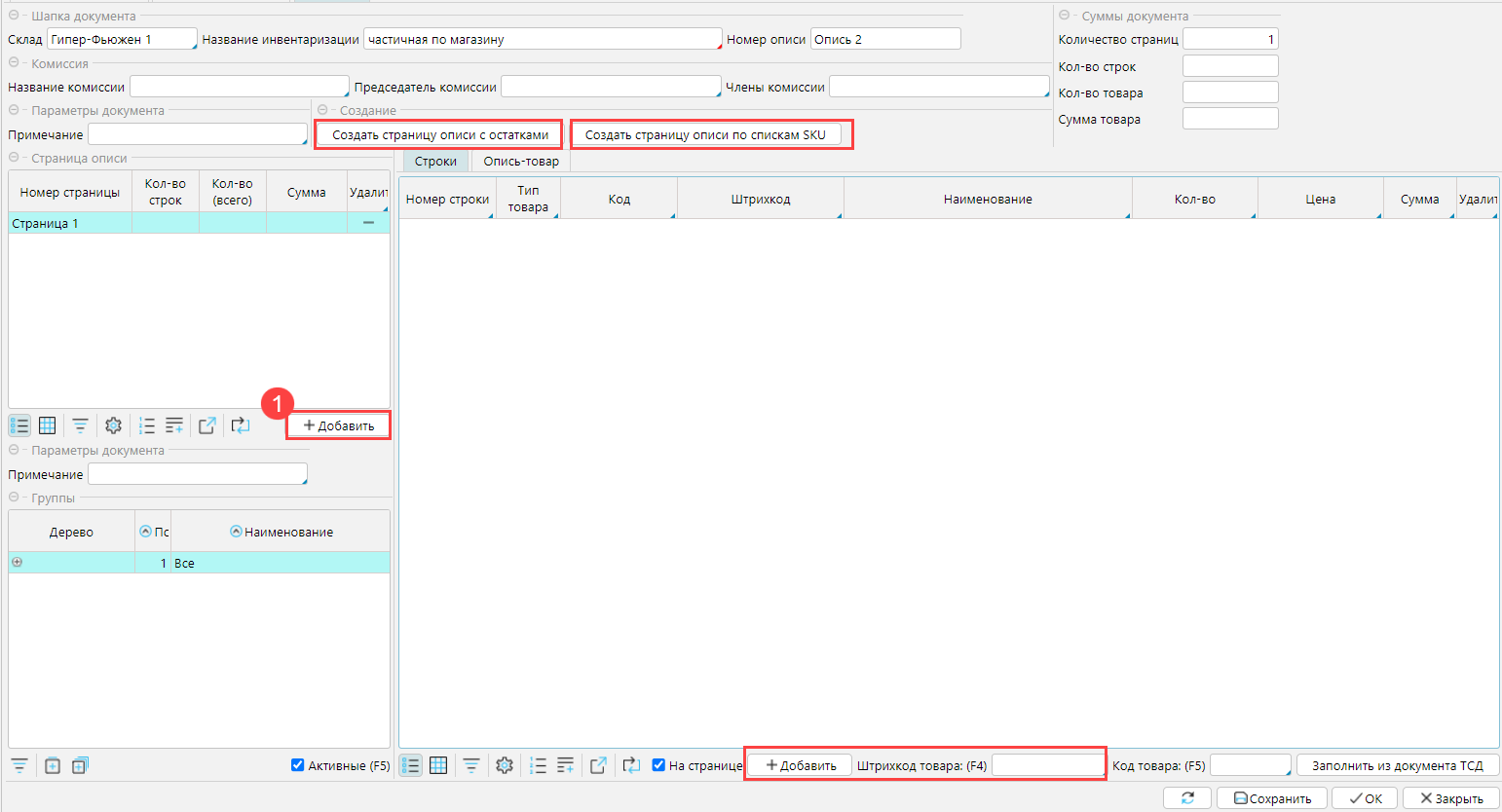 • вручную - сначала добавить страницу описи, затем на странице с помощью кнопки Добавить или ввода по Штрихкоду/Коду добавлять  товары.