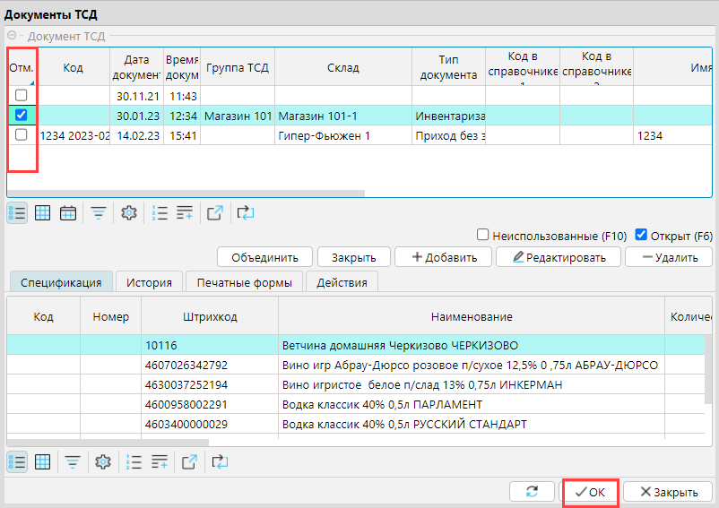 Заполнить из документов ТСД - если опись создается с помощью ТСД, необходимо нажать кнопку, выбрать документы ТСД и нажать ОК (рис. 1,2).