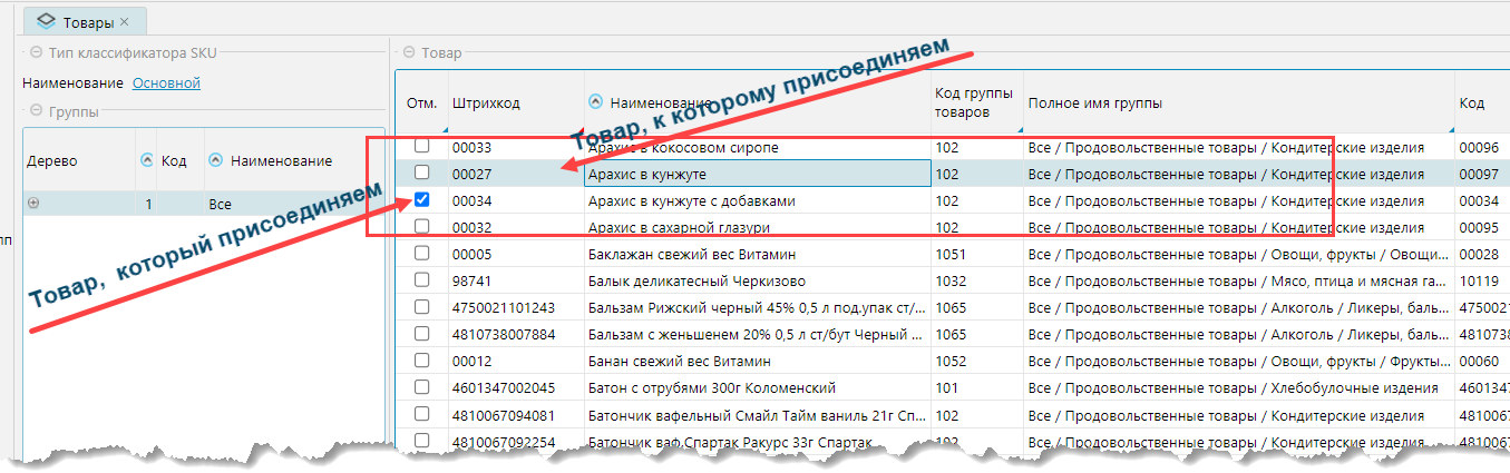 Находясь в справочнике товаров, необходимо отметить галочкой тот товар(ы), который необходимо присоединить.