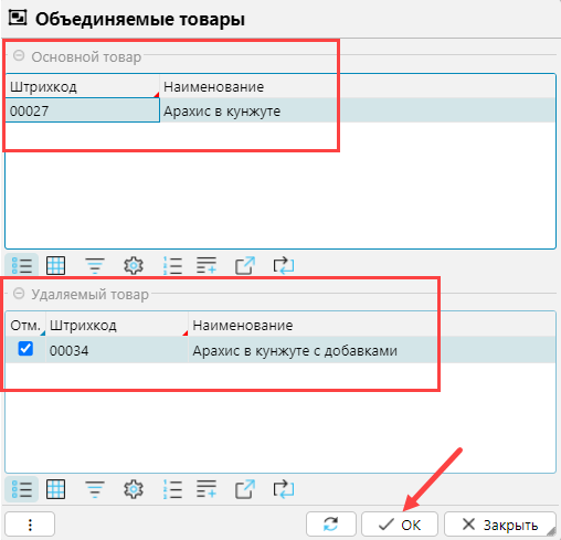 В форме подтверждения еще раз проверить правильность слияния товаров.