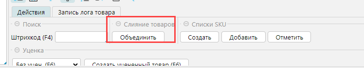 Действие работает это по принципу "заменить и удалить", т.е. в справочнике остается Основной  товар, к которому мы присоединяем (на котором курсор и нет отметки), товар, который мы присоединяем (отмеченный) удаляется. Никакие характеристики удаляемых товаров не переносятся в выбранный единственно нужный. В том числе штрихкоды.