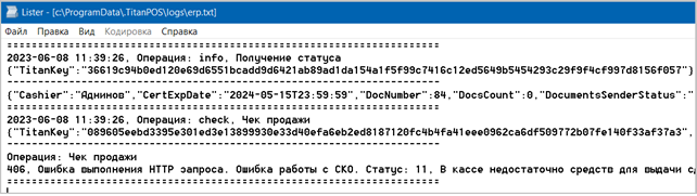 Содержание конфигурационного файла, использованного для написания стыковки с ERP, находится на внутреннем сервере по адресу e:\InstLux\!Programm_KSA\TitanPos\Install.