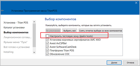 Установка программного обеспечения программной кассы осуществляется запуском инсталляционного пакета, который установит необходимы набор программ, библиотек и сертификатов, а также позволит сделать выбор между настройками тестовой или промышленной зоны.