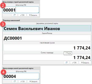 Замена карты - позволяет заменить клиенту существующую дисконтную карту на другую.  При замене карты данные старой карты переносятся в новую (данные владельца, накопленные суммы и бонусы). Новая карта должна быть уже заведена в системе.