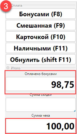 В POS кассир видит количество бонусов на дисконтной карте покупателя. Чтобы использовать бонусы для оплаты нужно: