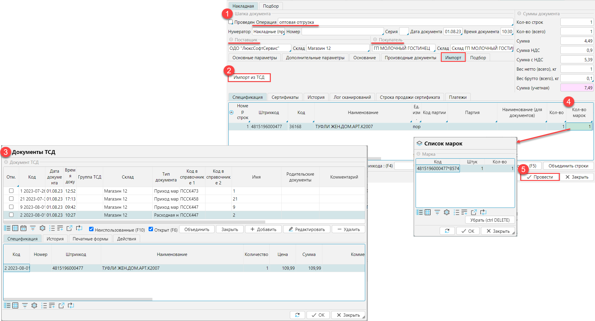 - Создайте расходную накладную и импортируйте в нее коды маркировки товаров
