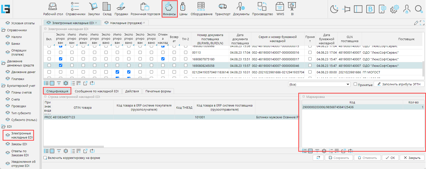 - Просмотреть коды маркировки в ЭН можно на форме Электронные накладные на вкладке Спецификация в таблице Маркировка.