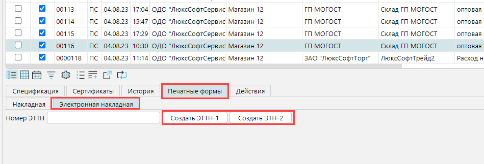- на форме Продажи - Накладные выделите накладную и на вкладке Печатные формы - Электронная накладная нажмите Создать ЭТТН-1 или Создать ЭТН-2, в зависимости от того, какой тип электронной накладной нужен