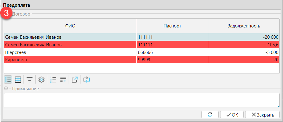 3. Появится список договоров с покупателями физическими лицами, по которым внесена предоплата. Те договоры, предоплата по которым не покрывает сумму чека, будут отмечены красным. Кассир выбирает договор и нажимает ОК