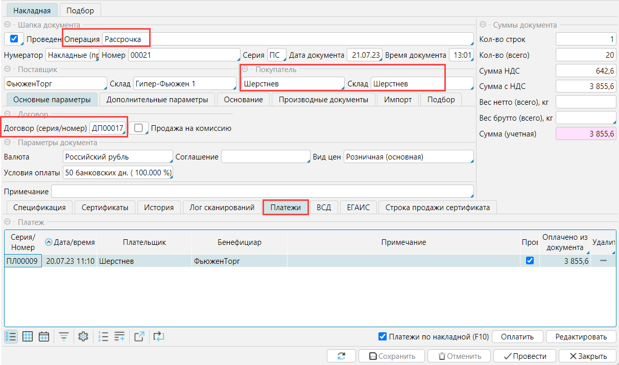 4. Система создаст накладную продажи для выбранного покупателя с привязкой к договору и распишет авансовый платеж на сформированную накладную.