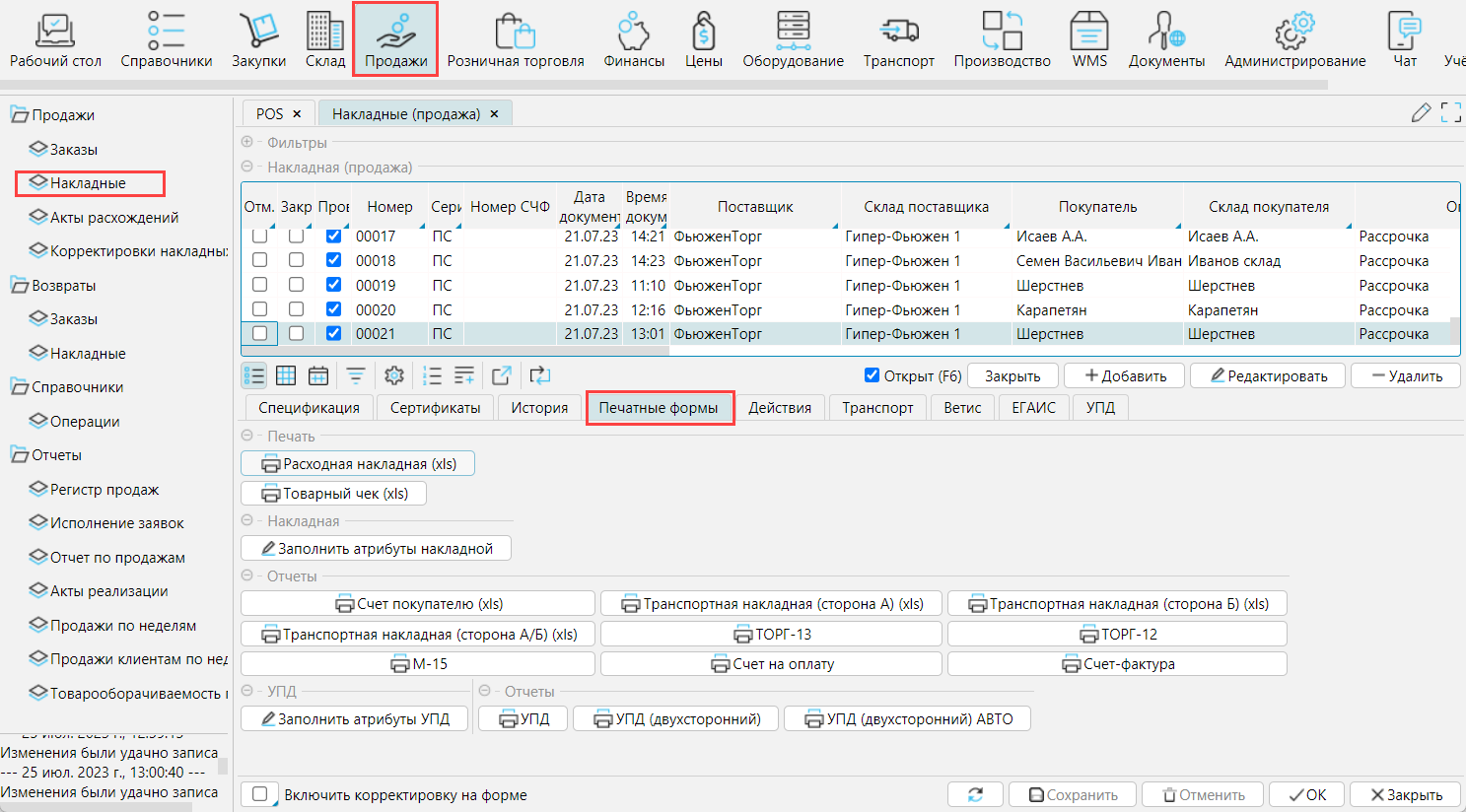 При необходимости сопроводительные документы по накладной можно напечатать в Продажи - Накладные - Печатные формы