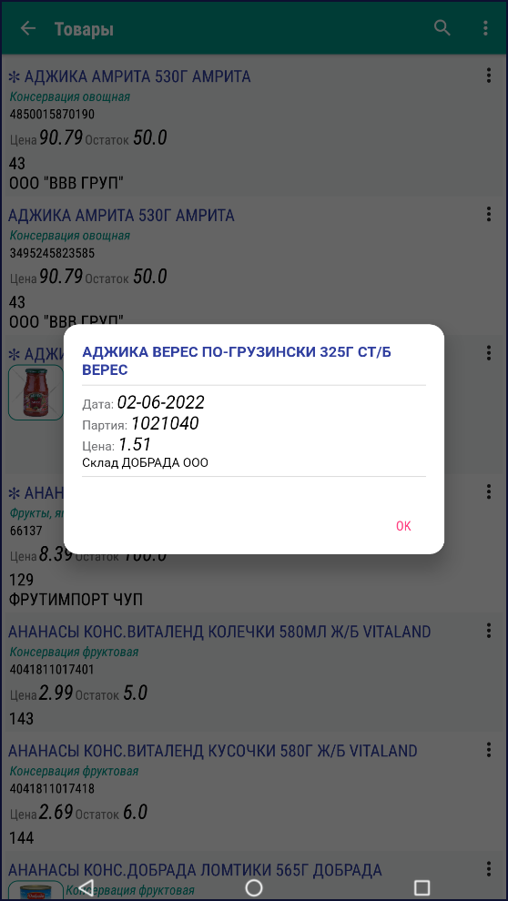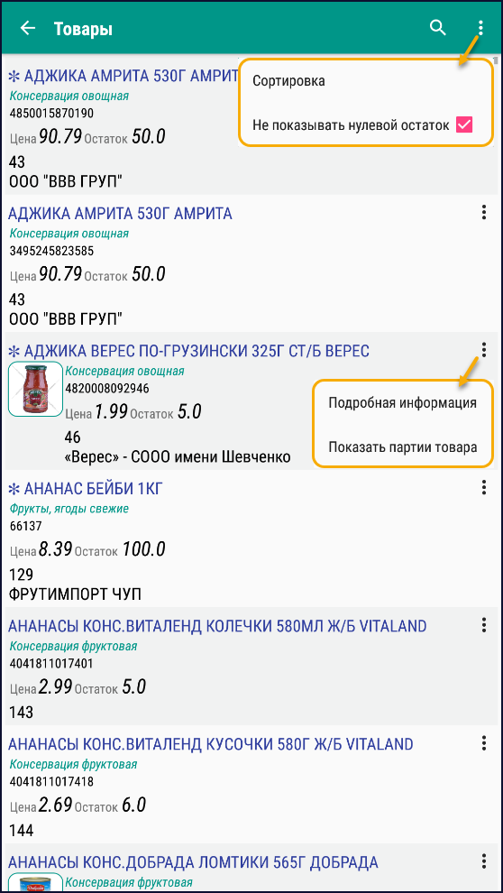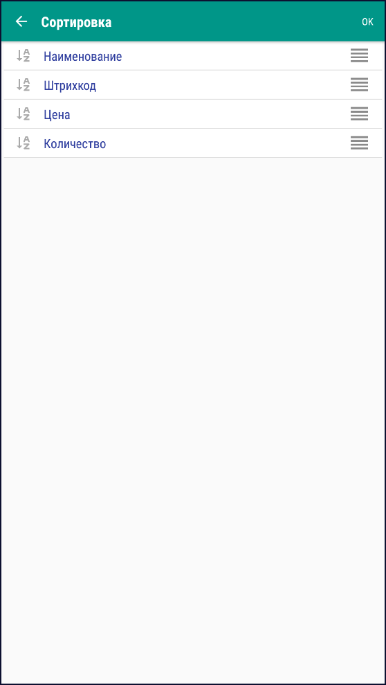 В меню справочника можно выбрать порядок Сортировки: по количеству, цене или штрихкоду.