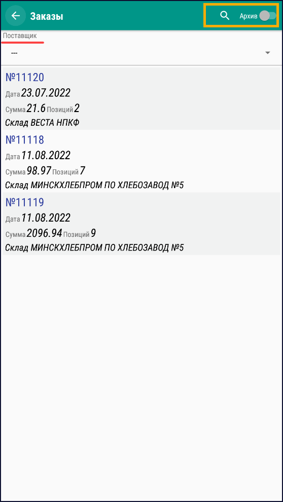 Заказы, которые были использованы в документах в текущей сессии переходят в архив. Их можно просмотреть, переключив тумблер Архив.