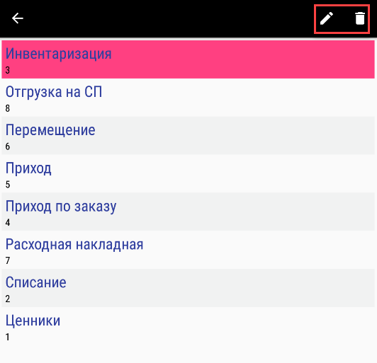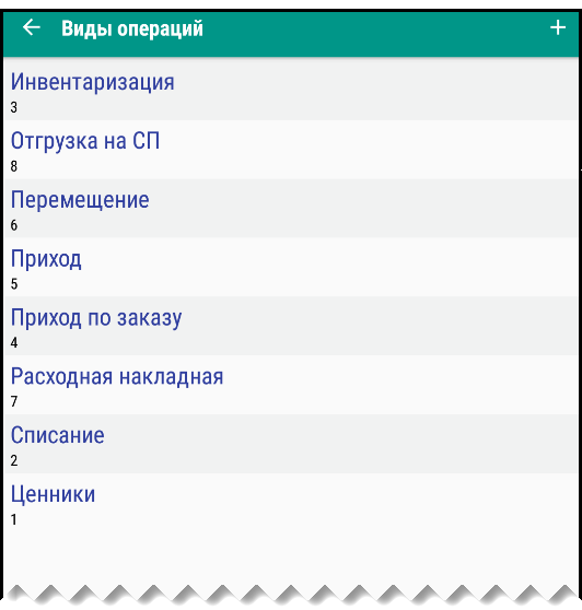 В меню отображаются настроенные виды операций, загруженные из торговой системы. Также, создавать и настраивать операции можно непосредственно в модуле на устройстве, однако после обмена данными с системой lsFusion ERP локальные настройки будут заменены глобальными из системы.