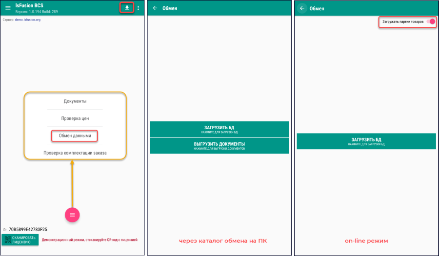 Для загрузки данных в ТСД можно использовать кнопку Загрузить или выбрать в рабочем меню пункт Обмен данными.