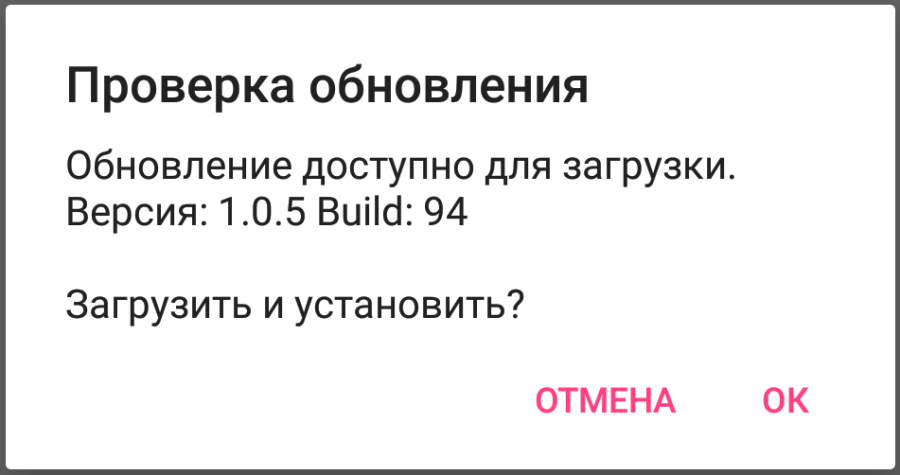 • Фоновая проверка – при запуске модуля автоматически будет отправлен запрос на сервер на наличие новой версии программы. Проверку обновлений в ручном режиме можно запустить из служебного меню главного экрана (см. п. Главный экран). При ручном запуске запроса будет отображено сообщение об отсутствии или доступности новой версии. При автоматической проверке сообщение будет отображаться только при наличии новой версии на сервере.