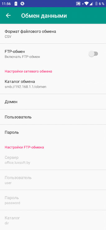 • Обмен данными – настройки формата файлового обмена с ПК.