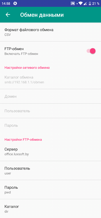 • FTP-обмен – включает механизм обмена через FTP-сервер и открывает настройки FTP-сервера.