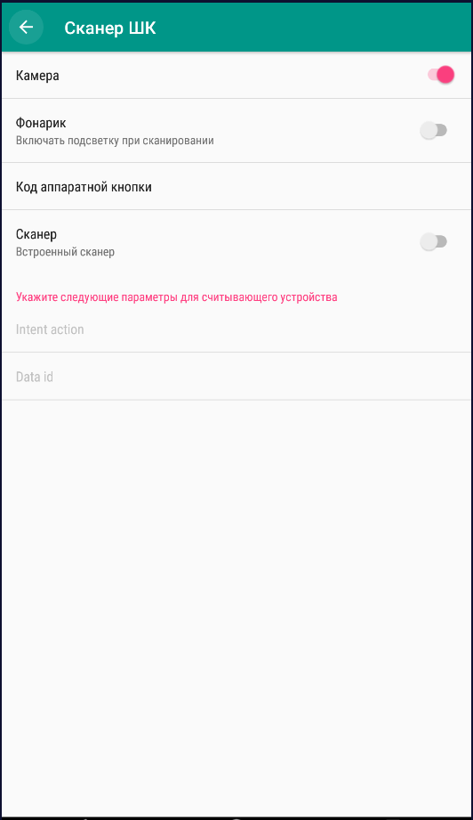 Экран настройки сканера штрих-кодов. Здесь можно включить камеру или встроенный сканер для распознавания штрих-кодов. Для вызова камеры можно указать код аппаратной кнопки. По умолчанию камера вызывается клавишей громкости.