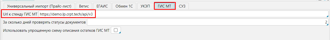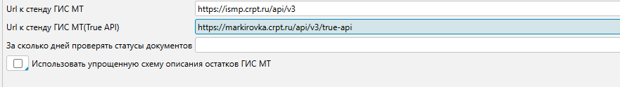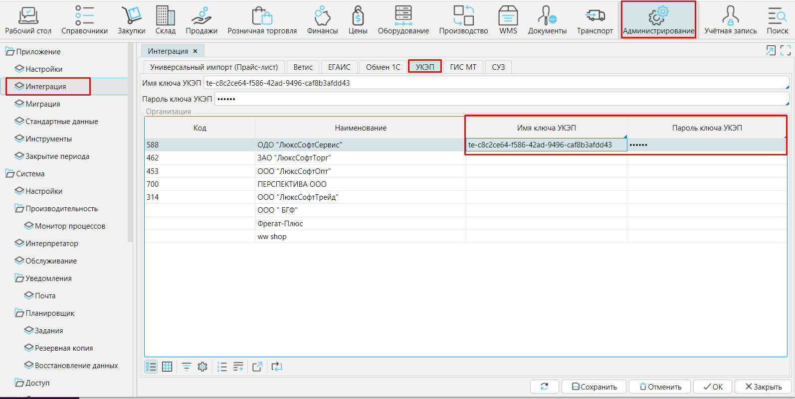 В Администрирование – Интеграция вкладка УКЭП ввести имя и пароль ключа усиленной квалифицированной электронной подписи (УКЭП) для каждой компании, которая будет работать с ГИС МТ «Честный знак». Вверху формы можно указать данные, которые будут использоваться по умолчанию.