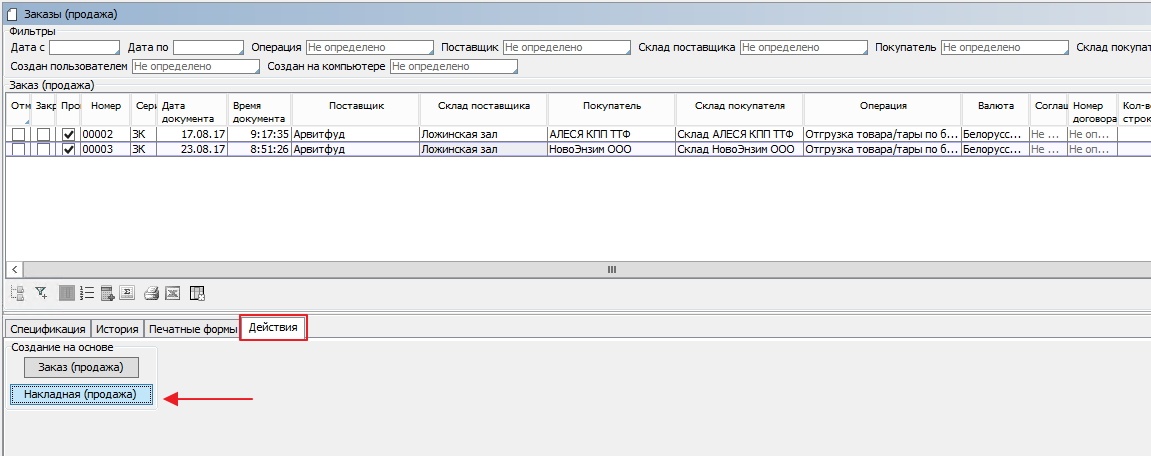 Находим счет-фактуру на основе которой нужно сформировать накладную, становимся на нее и переходим во вкладку Действия.