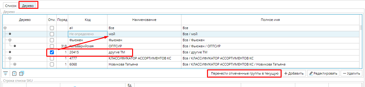 Списки SKU могут иметь иерархическую структуру. Она видна при просмотре списков на вкладке Дерево. В иерархическом представлении в блоке Строка списка отображаются товары выделенного и вложенных списков.