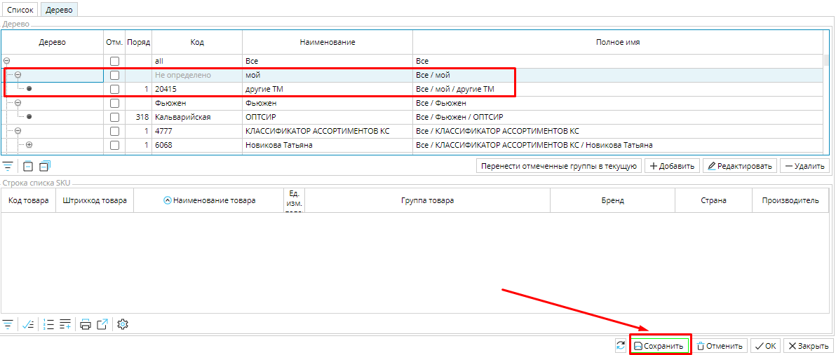 Все изменения, сделанные в иерархии списков SKU, необходимо Сохранить, чтобы они были применены.