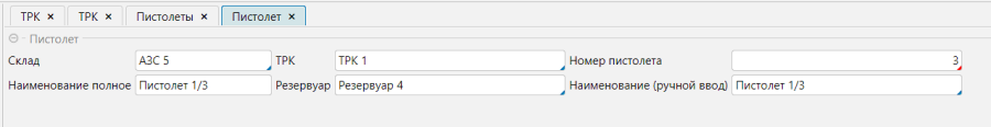 Для пистолета указывают Склад и ТРК, к которой он относится, обязательно Номер, и указывают Резервуар, к которому подключен пистолет. При отпуске с этого пистолета топливо будет списываться с указанного резервуара.