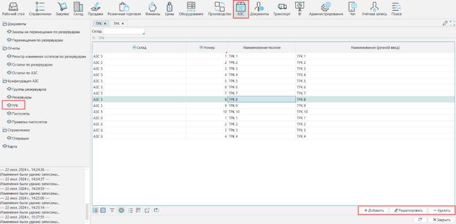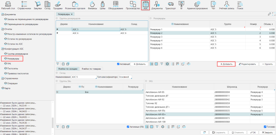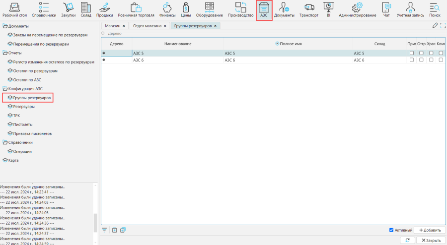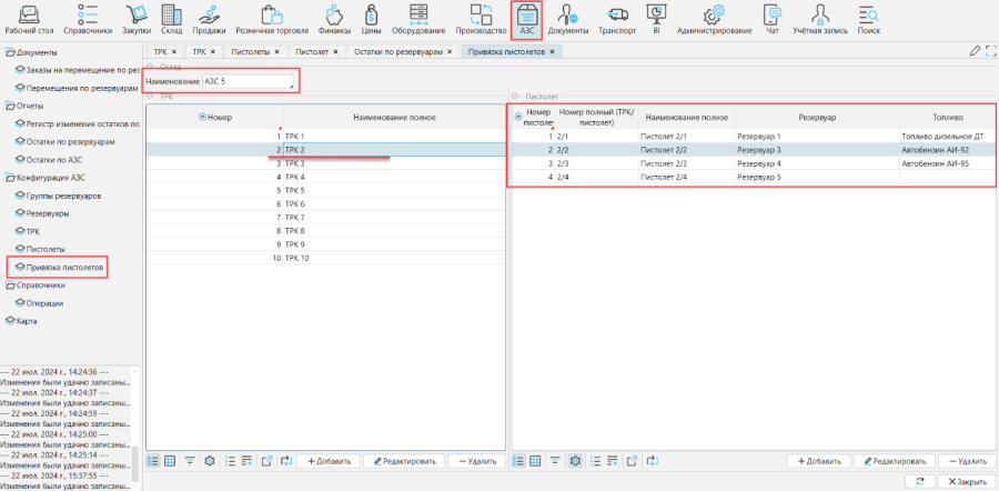В системе создаются группы резервуаров, которые соответствуют физическим АЗС. Затем в каждой группе создаются резервуары, в которые идет приемка/отгрузка топлива. Далее нужно создать справочник ТРК и пистолетов, через которые осуществляется розничная продажа топлива. Пистолеты привязываются к резервуарам.