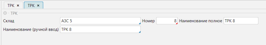 На форме АЗС – ТРК нужно создать топливораздаточные колонки для каждой АЗС (группы резервуаров). Для ТРК указывают обязательно Склад, Номер и можно вводить удобное Наименование вручную.