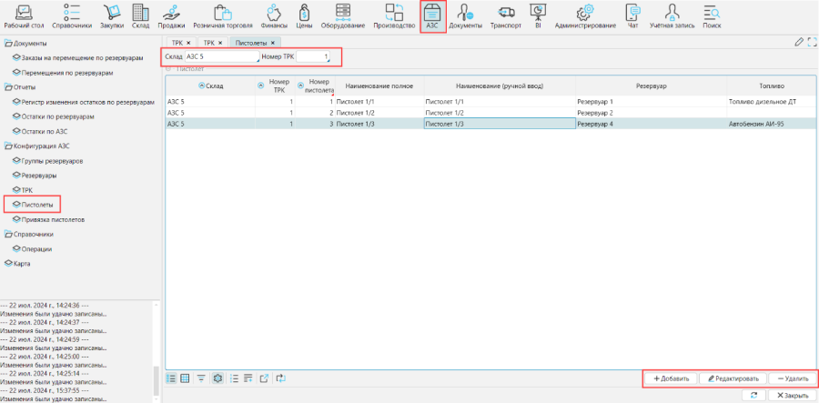 Далее на форме АЗС – Пистолеты вводим по каждой ТРК пистолеты. На форме удобно отфильтровывать отображение пистолетов по Складу и ТРК.