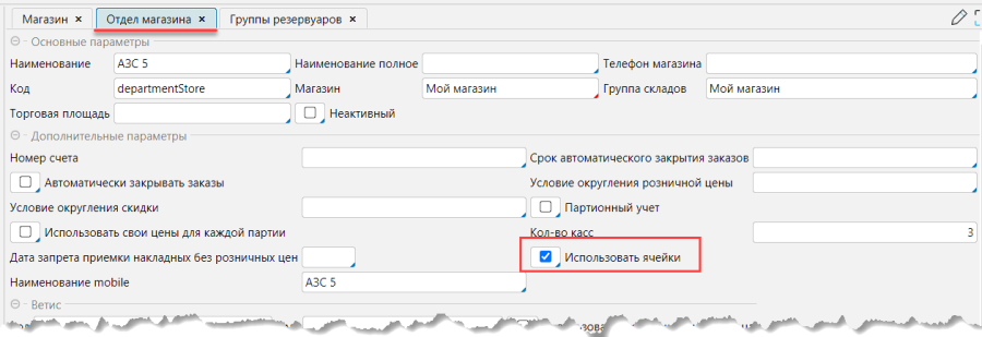 Чтобы создать группу резервуаров, на форме отдела магазина нужно отметить свойство Использовать ячейки. Автоматически (после сохранения изменений) на форме АЗС – Группы резервуаров появится группа резервуаров с таким же названием, как отдел магазина.