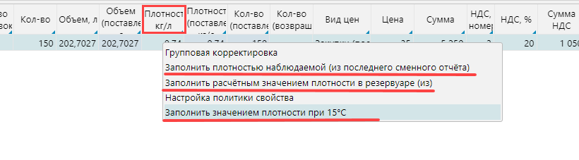 Для плотности, если нет текущего фактического значения, можно использовать значение из последнего сменного отчета, расчетное значение плотности в резервуаре или значение по умолчанию из карточки товара. Для этого в поле Плотность кг/л нужно вызвать контекстное меню и выбрать соответствующую команду.