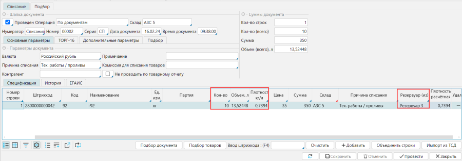 В упомянутых документах обязательно фиксируют количество в килограммах, объем в литрах и плотность перемещаемого топлива. В документ достаточно ввести 2 величины из 3-х, третья рассчитывается.