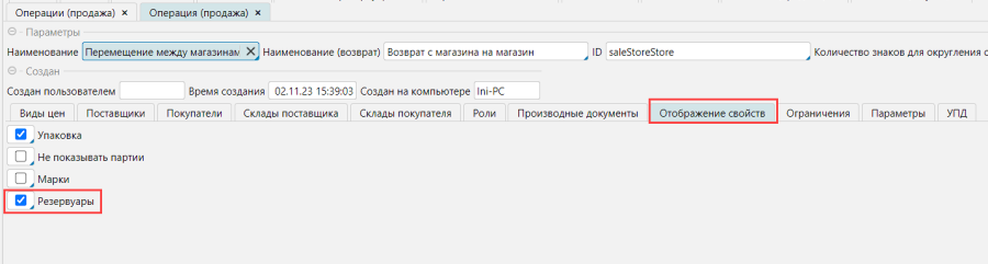Также во всех документах товародвижения указывается резервуар, куда поступает или откуда отгружается топливо. Чтобы в документе была возможность указывать резервуар, в настройках соответствующей операции на вкладке Отображение свойств должно быть отмечено свойство Резервуары.
