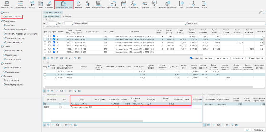 Реализация топлива производится в литрах. Реализация загружается в систему как кассовые отчеты с детализацией по чекам. В чеке фиксируется пистолет и резервуар, из которого отпускалось топливо, и проданный объем в литрах, а также количество в кг и плотность. Количество и плотность могут быть либо также получены с кассового или топливного сервера (по результатам измерений), либо рассчитаны на основании расчетной плотности топлива в резервуаре. Данные по результатам измерений более точные.