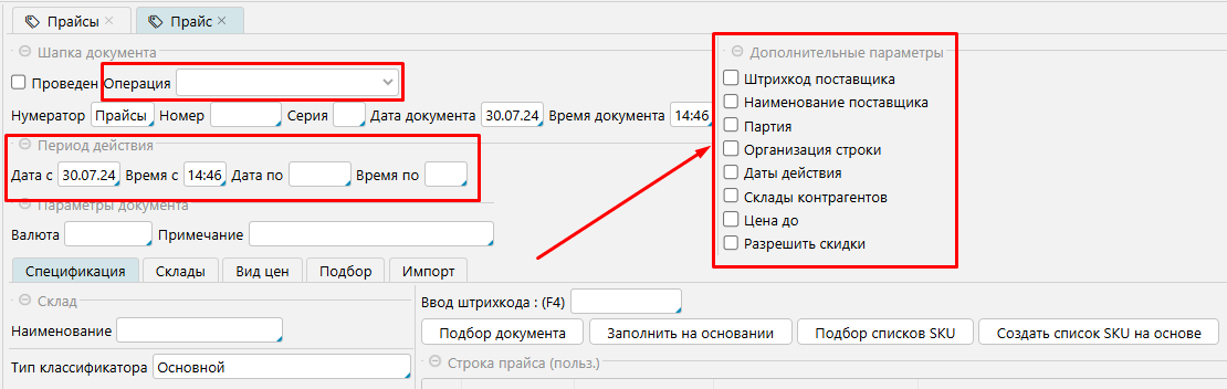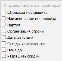 В области "Дополнительные параметры" мы можем настраивать дополнительные свойства, действующие для каждой строки Прайса