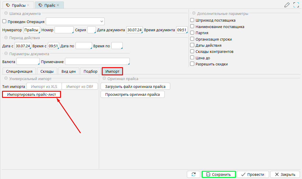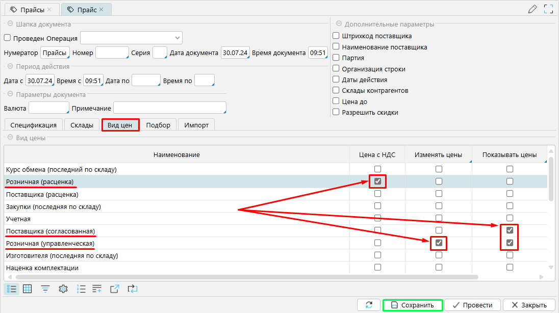 После включения необходимых товаров в прайс, а так же внесения всех требуемых настроек, необходимо сохранить Прайс и нажать "Провести" для вступления его в силу.