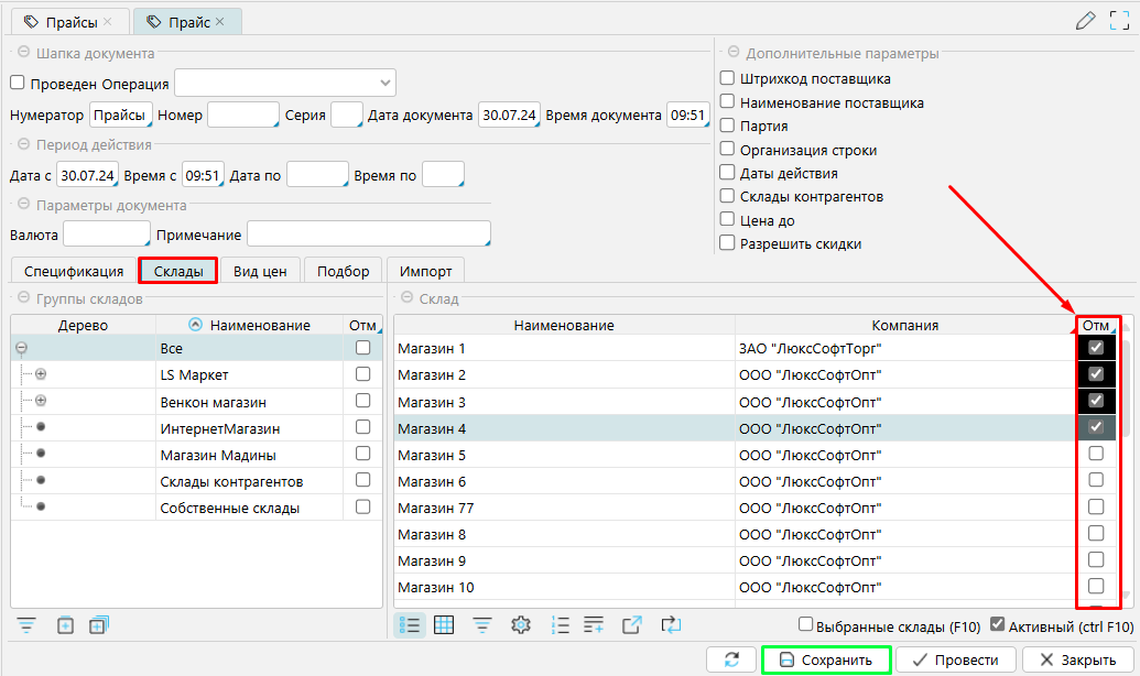 Выбор склада, для которого будет действовать прайс, осуществляется во вкладке "Склады"