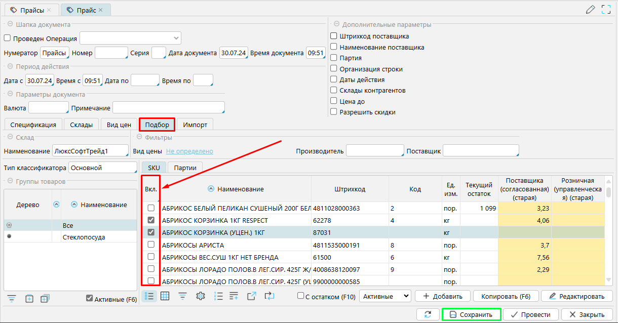 Включение товаров в Прайс производится во вкладке "Подбор", путем внесения отметки в поле "Вкл"