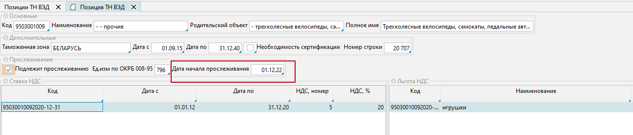 Чтобы данные о расходе прослеживаемых товаров направлялись в СПТ в требуемом формате из электронных накладных, необходимо указать дату начала прослеживаемости у кода ТН ВЭД