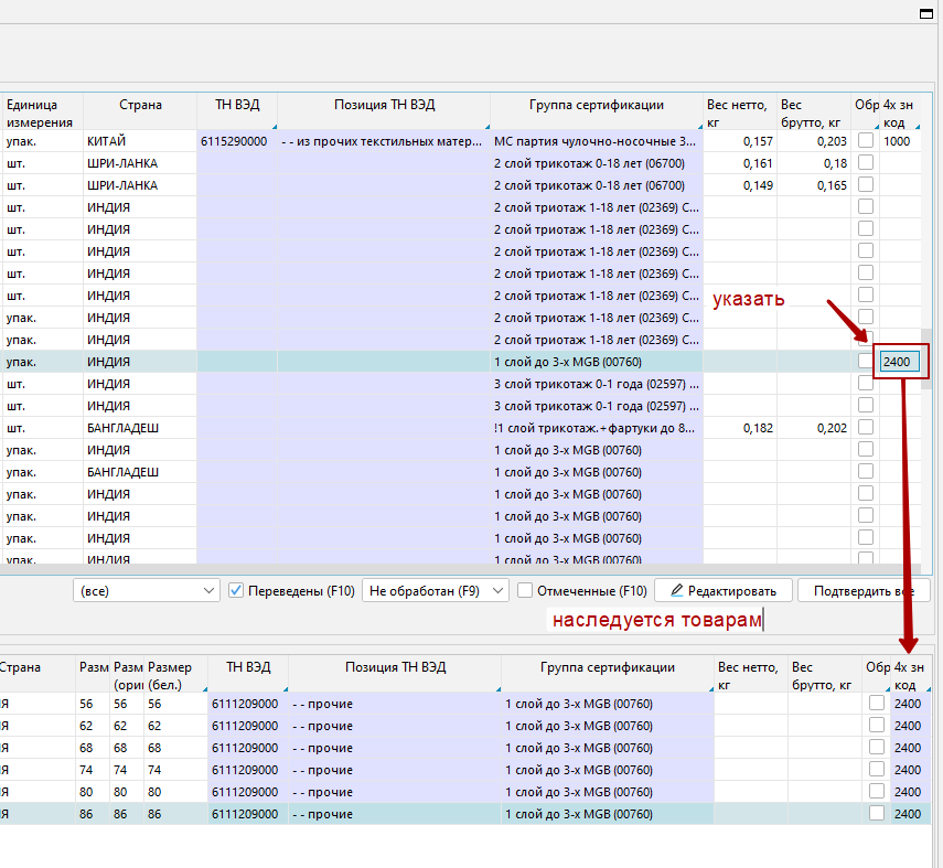 5. На форме Заполнение ТН ВЭД. При назначении 4-значного кода артикулу в колонке 4-зн код, он наследуется также товарами артикула.