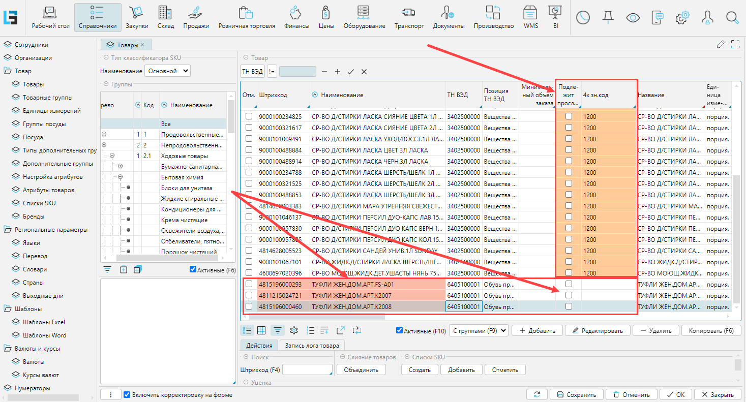 Для реализации прослеживаемости в документах товародвижения необходимо товарам в справочнике назначить коды ТН ВЭД и соответствующий товару 4-значный код. Если У кода ТН ВЭД только один 4-значный код, то он подтягивается автоматически. Если несколько, то нужно назначить подходящий код вручную. Для товаров реализована подсветка: