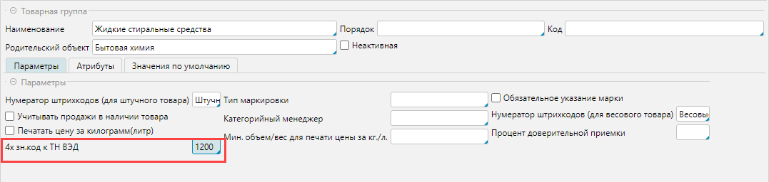 2. В настройках товарной группы указать 4-значный код, тогда всем товарам группы наследуется код. В этом случае код ТН ВЭД в товарах группы должен быть таким же, как код ТН ВЭД у 4-значного кода, если они разные программа не позволит назначить код на товарную группу.